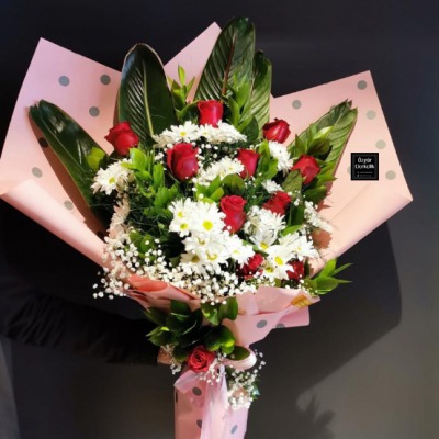 Şık bir tasarım ile hazırlanmış güzel bir Beyaz Papatya ve Gül Buketi.